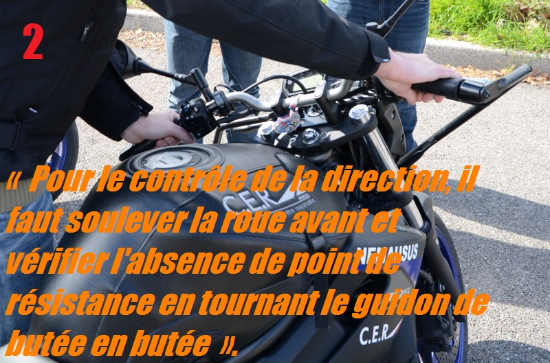 « Pour le contrôle de la direction, il faut soulever la roue avant et vérifier l'absence de point de résistance en tournant le guidon de butée en butée ».