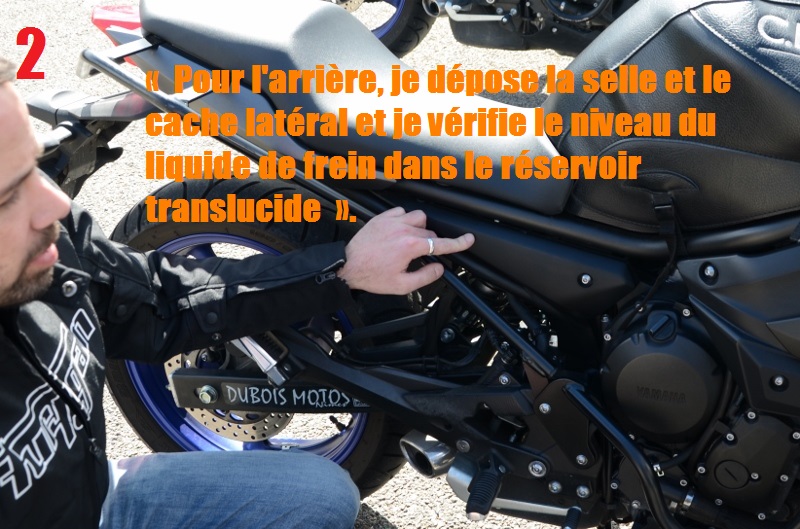 « Pour l'arrière, je dépose la selle et le cache latéral et je vérifie le niveau du liquide de frein dans le réservoir translucide, ce niveau est correct ».