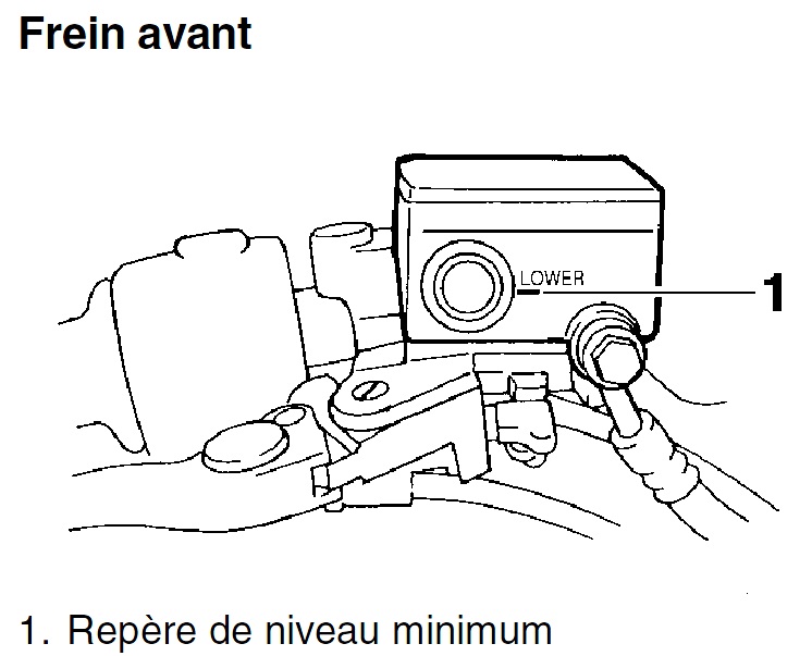 1) Commencez par le niveau du frein avant, tournez le guidon (vers la droite si la moto est sur la béquille latérale) pour mettre le bocal noir droit et vérifiez le niveau de liquide par le petit hublot à l'avant en le montrant. Le repère indique le niveau minimum. Vous déclarez ensuite :