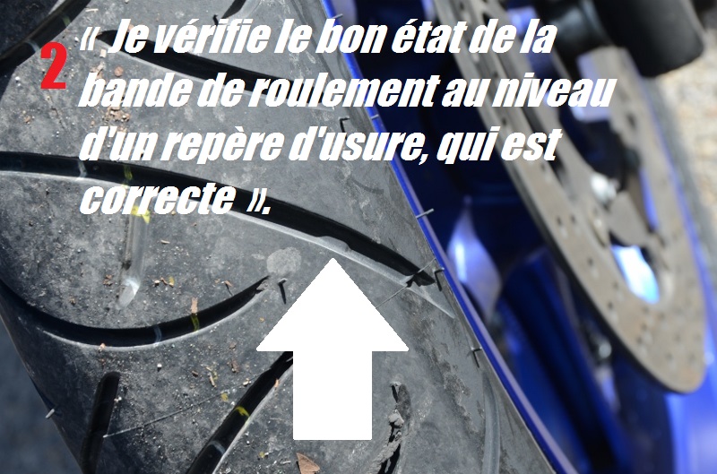 2) Vous indiquez ensuite un repère d'usure de la bande de roulement, pour en vérifier l'état et vous déclarez :