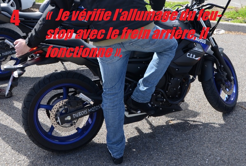 « Je vérifie l'allumage du feu-stop avec le frein arrière, il fonctionne ».