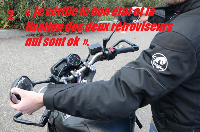 « je vérifie le bon état et la fixation des deux rétroviseurs qui sont corrects ».